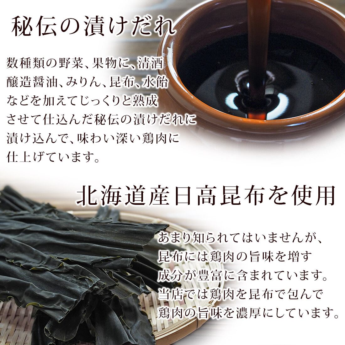 本醸造醤油、北海道産の日高昆布、みりん、酒、果物、野菜を合わせた特製の醤油だれにじっくりと漬け込み、熟成させた絶品たれ焼き鳥です。お家のグリルでもフライパンでもBBQでも簡単に焼き鳥やさんの焼き鳥が食べられます♪ お家のグリルでもフライパンでもBBQでも簡単に焼き鳥やさんの焼き鳥が食べられます♪